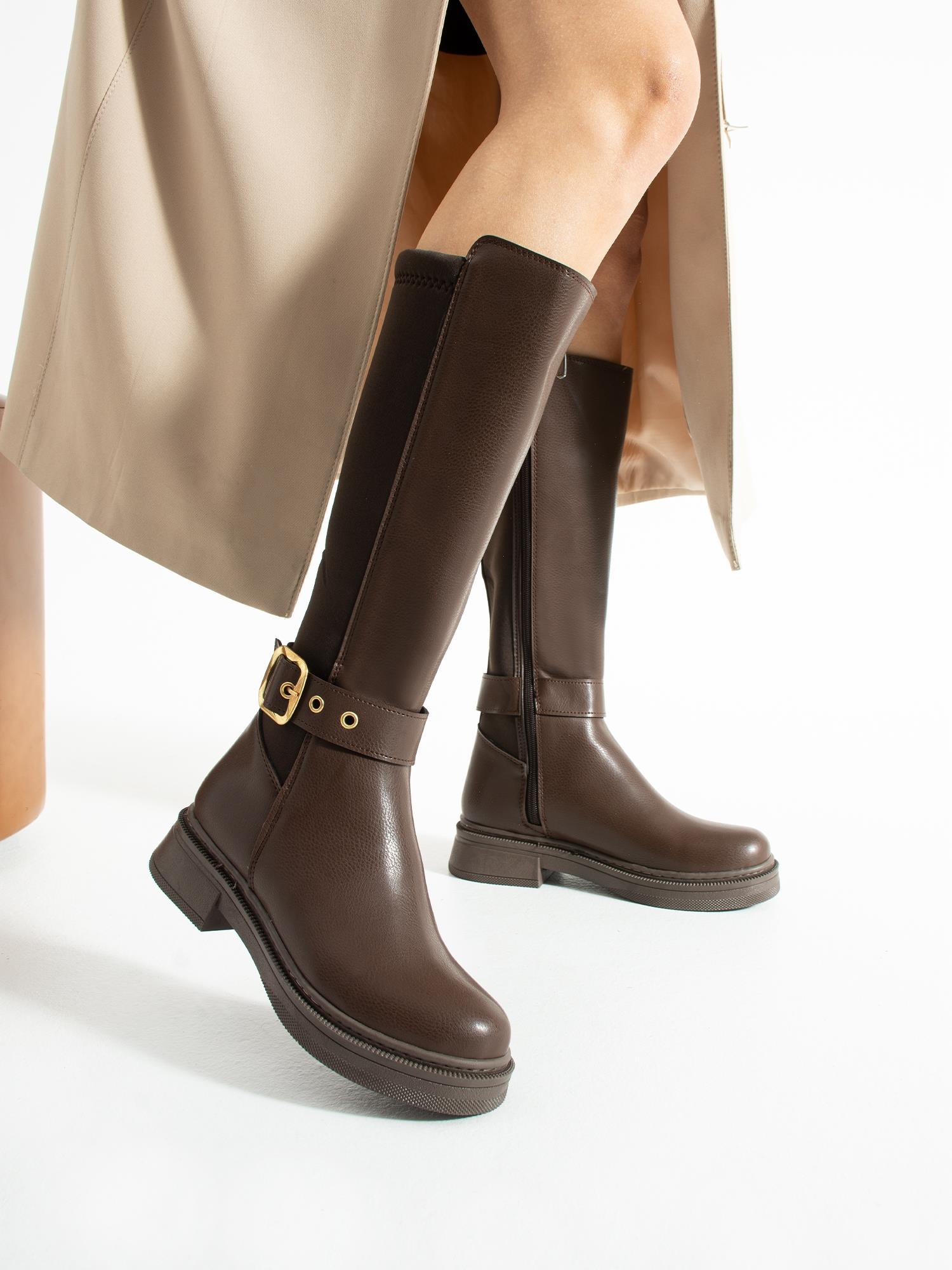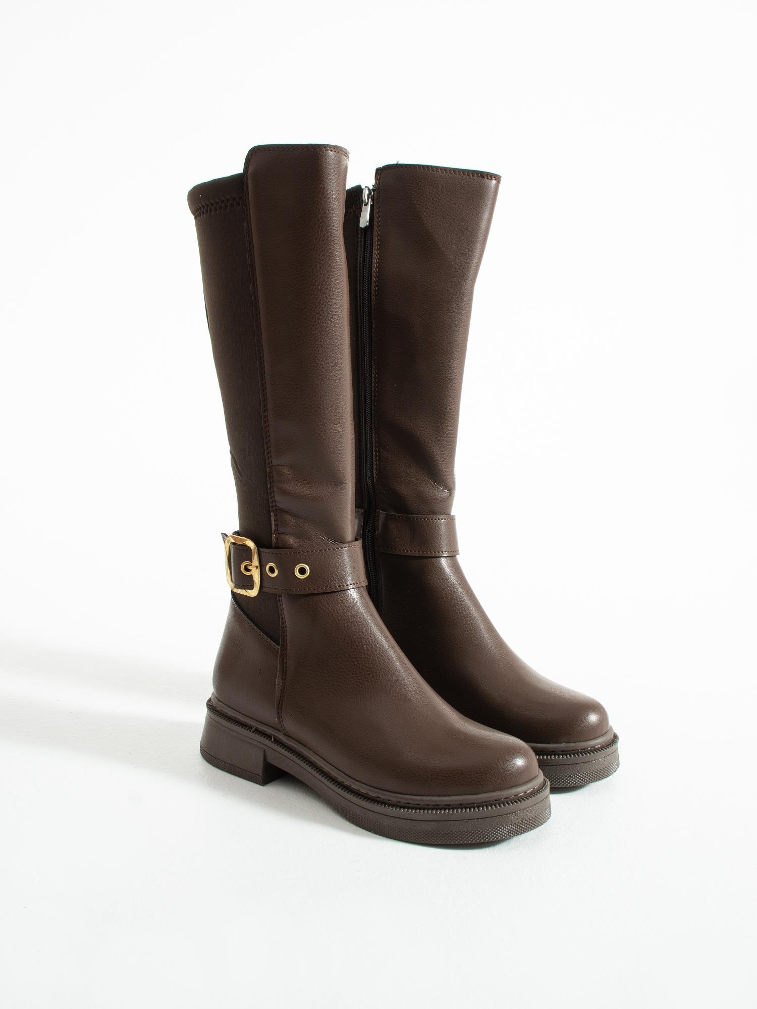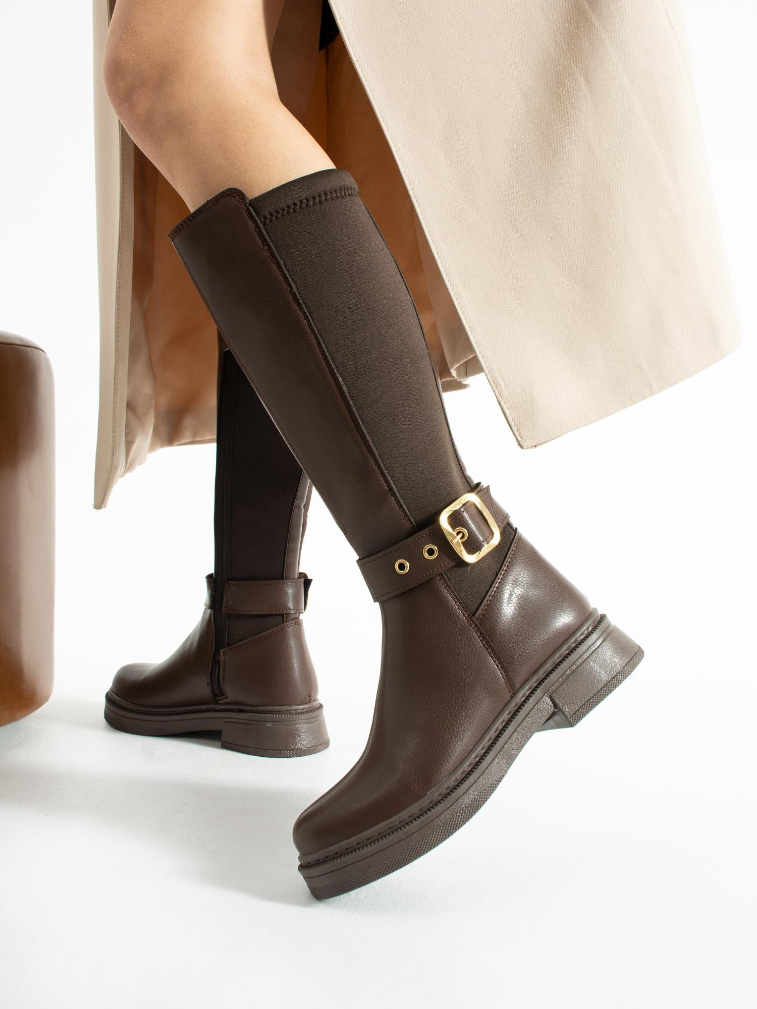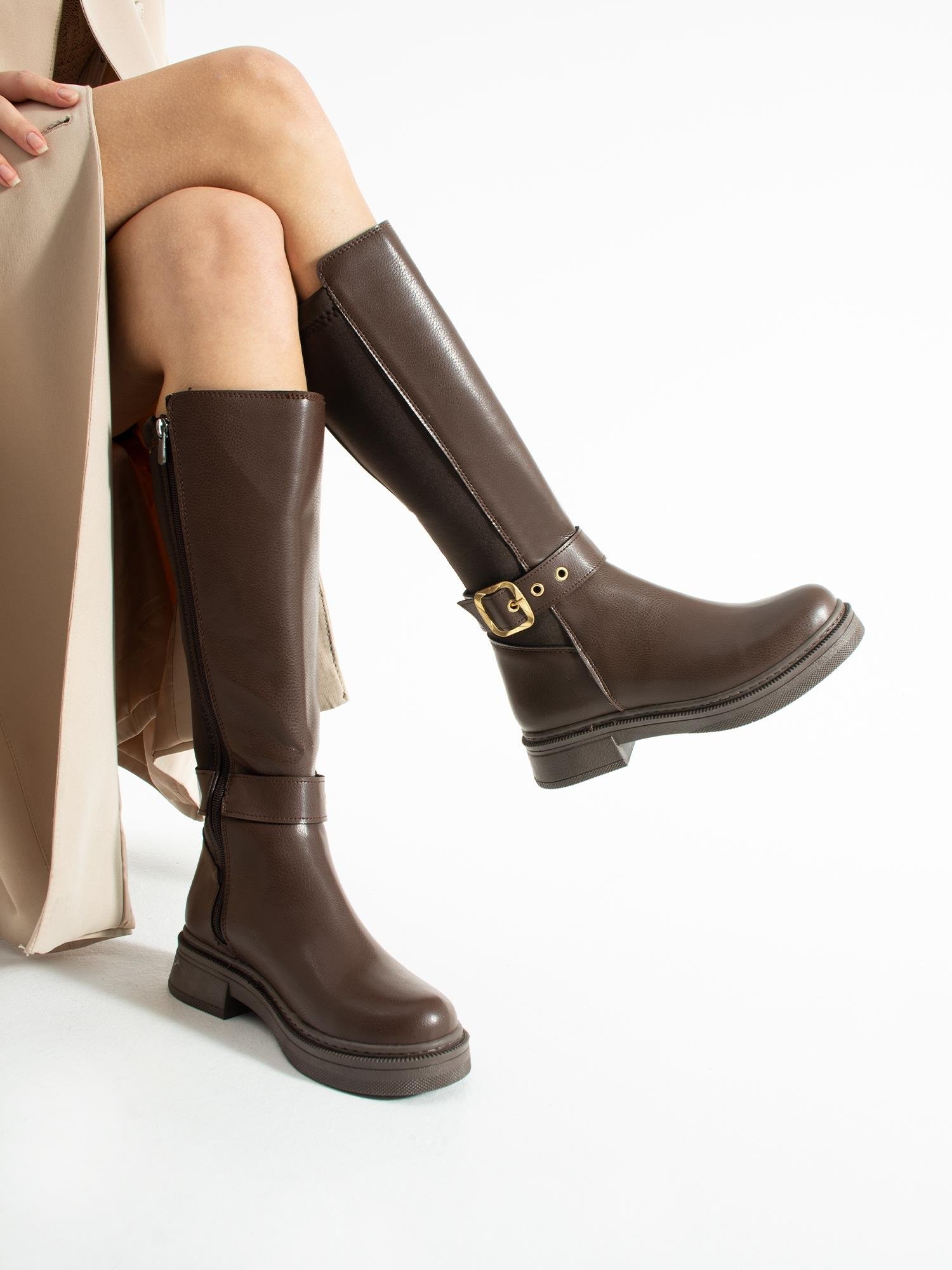 Altın toka detayıyla öne çıkan uzun çizme, rahat tabanı ve şık tasarımıyla günlük kombinlerinize zarif ve modern bir dokunuş katar