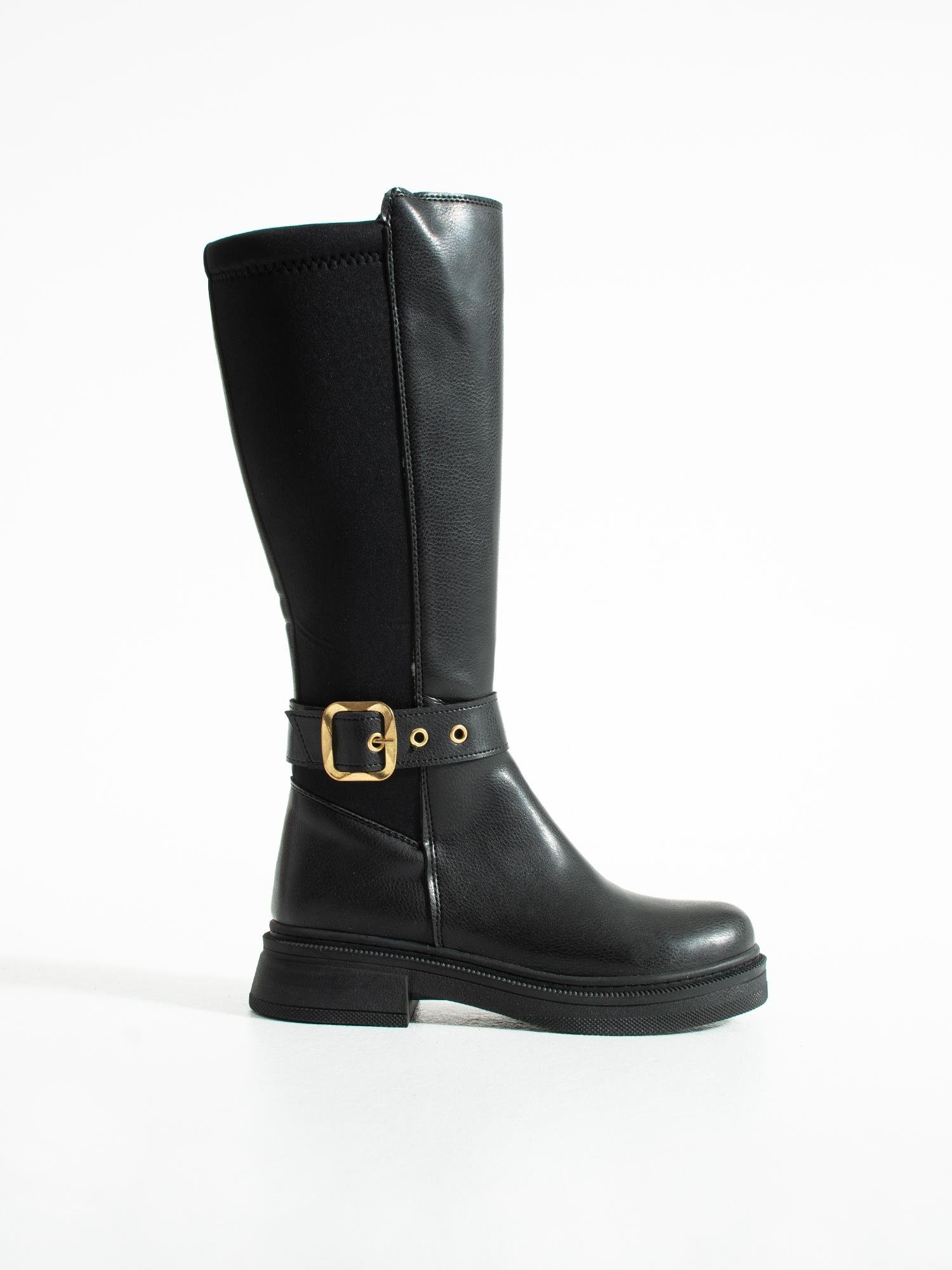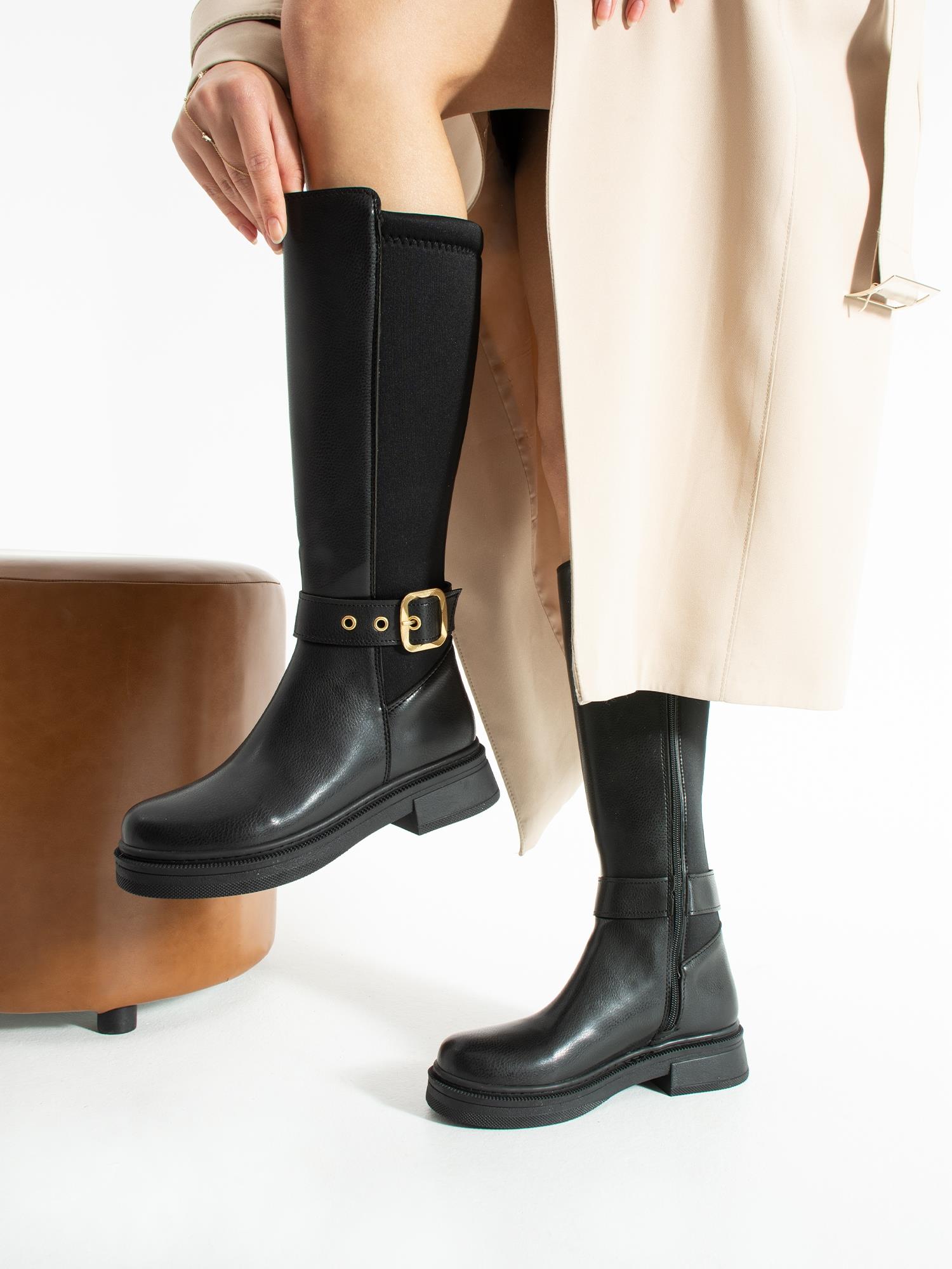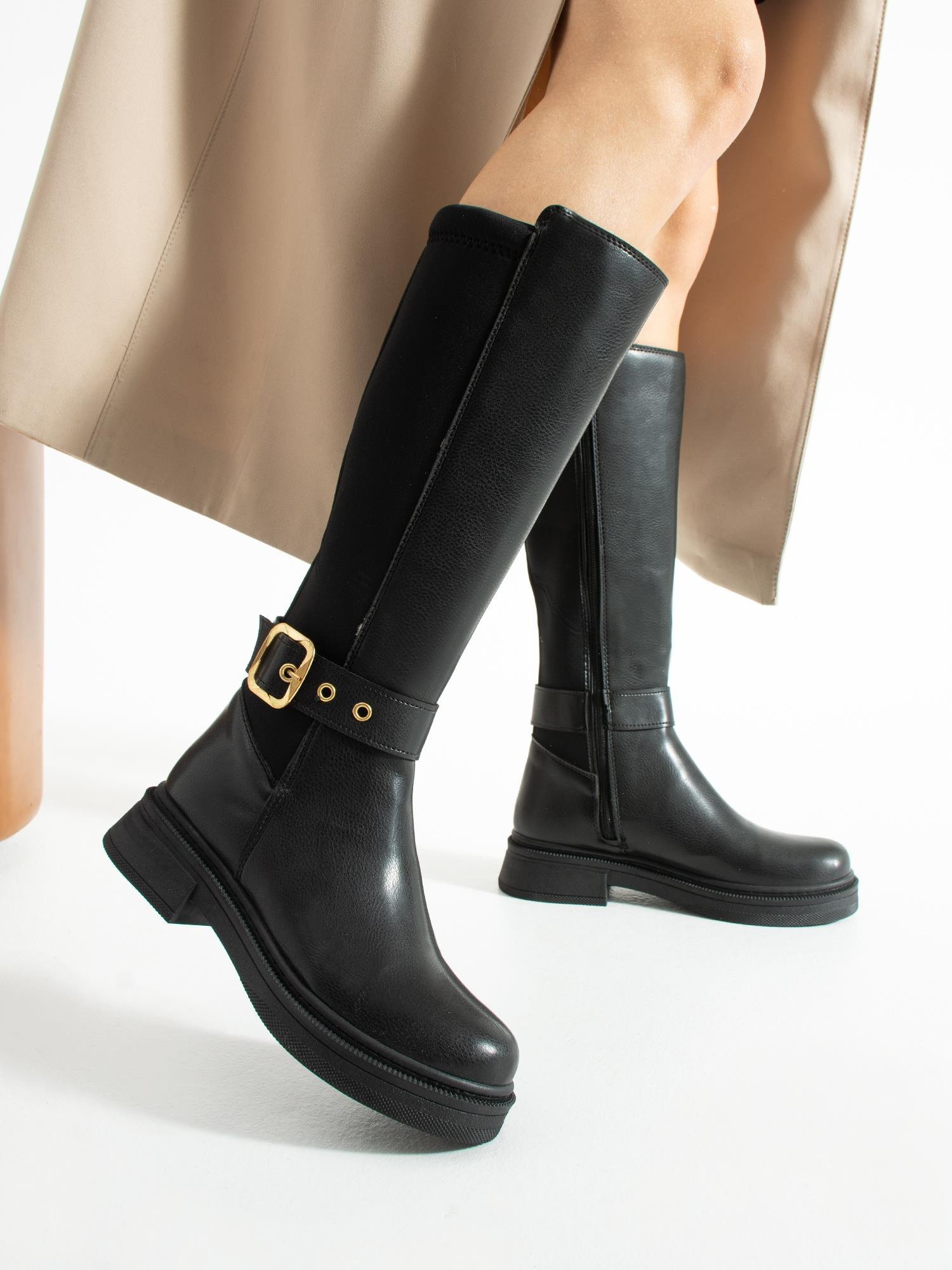 Altın toka detayıyla öne çıkan uzun çizme, rahat tabanı ve şık tasarımıyla günlük kombinlerinize zarif ve modern bir dokunuş katar
