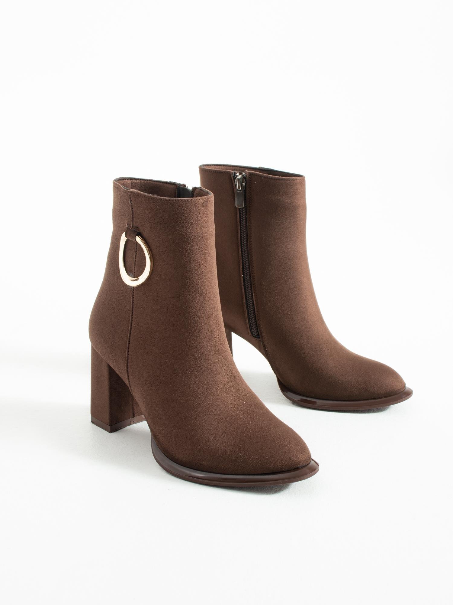 Zarif tasarımı ve altın halka detayıyla dikkat çeken kahverengi süet topuklu kadın bot, modern şıklığı ve konforu bir arada sunar