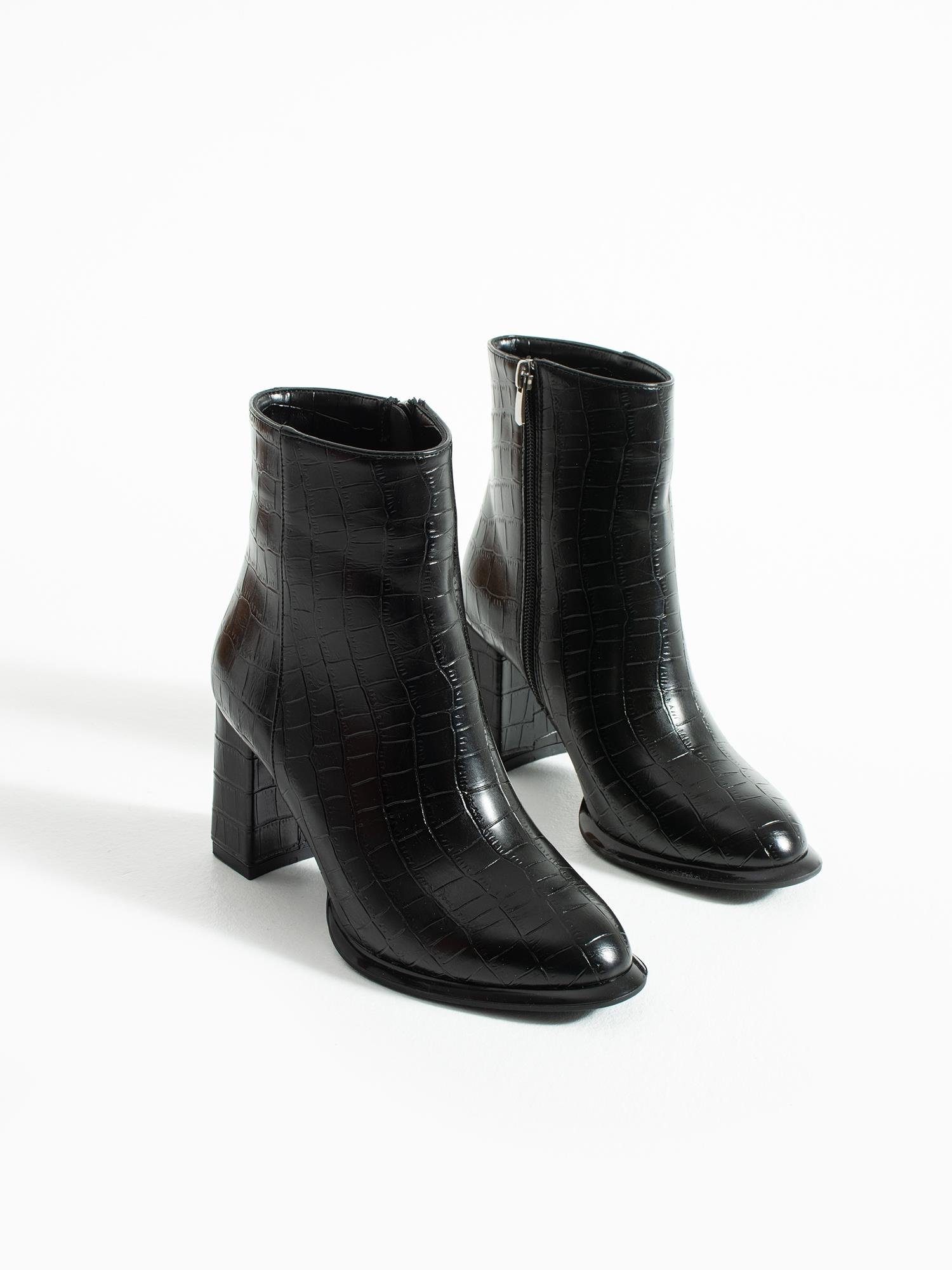 Modern şıklığın vazgeçilmezi krokodil desenli kısa bot. Kalın topuğu sayesinde rahat yürüyüş sağlar, özgün tasarımıyla stilinize zarafet ve güçlü bir duruş katar.