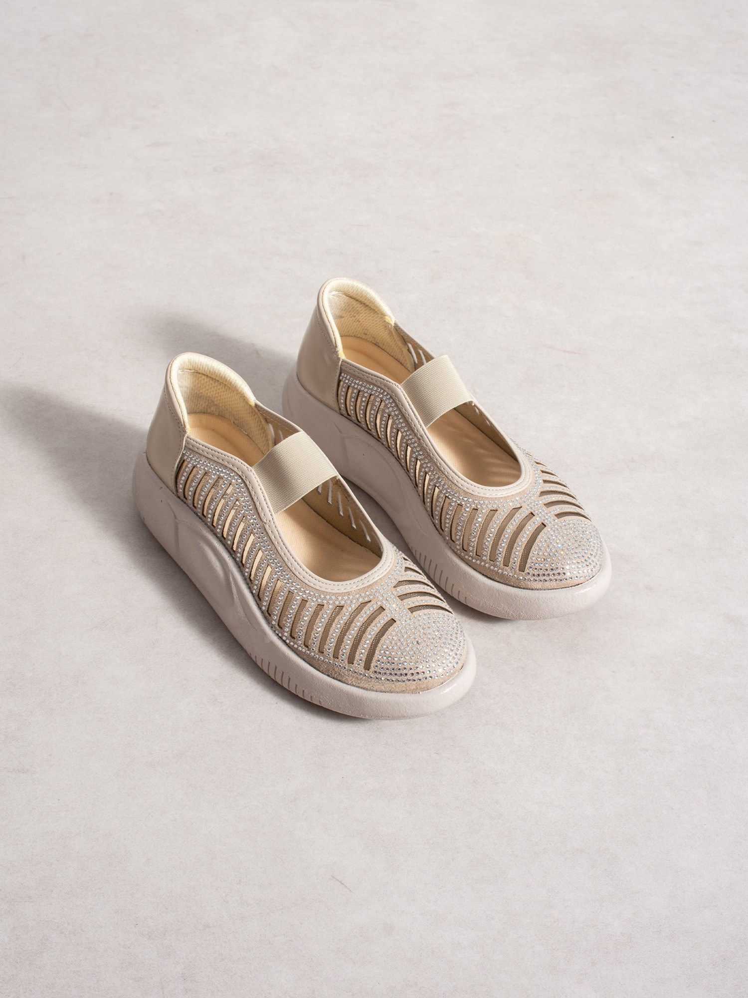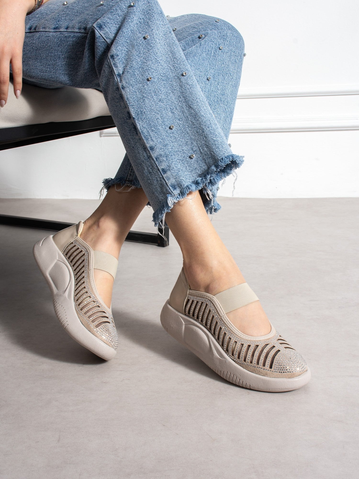 Günlük kullanım için tasarlanan bu kadın ayakkabı, ortopedik tabanı ve hafif yapısıyla gün boyu konfor sağlar. Nefes alabilen kesim detayları ve zarif taş süslemeleriyle şık bir görünüm sunarken, elastik bant yapısı sayesinde ayağa kolayca uyum sağlar ve pratik kullanım imkanı sunar.