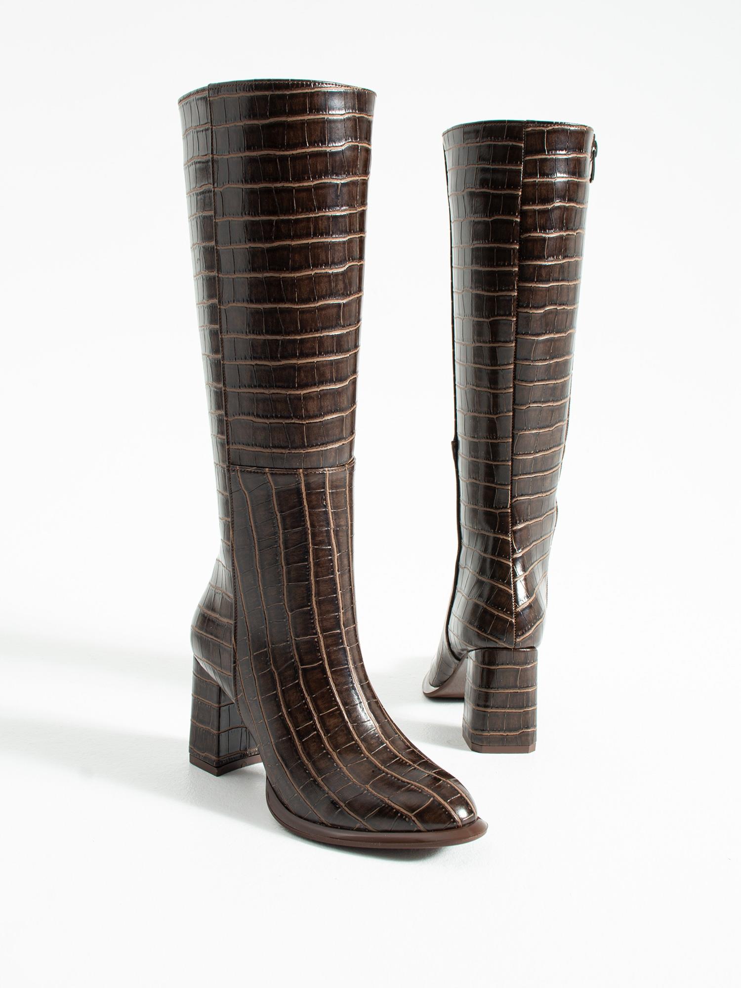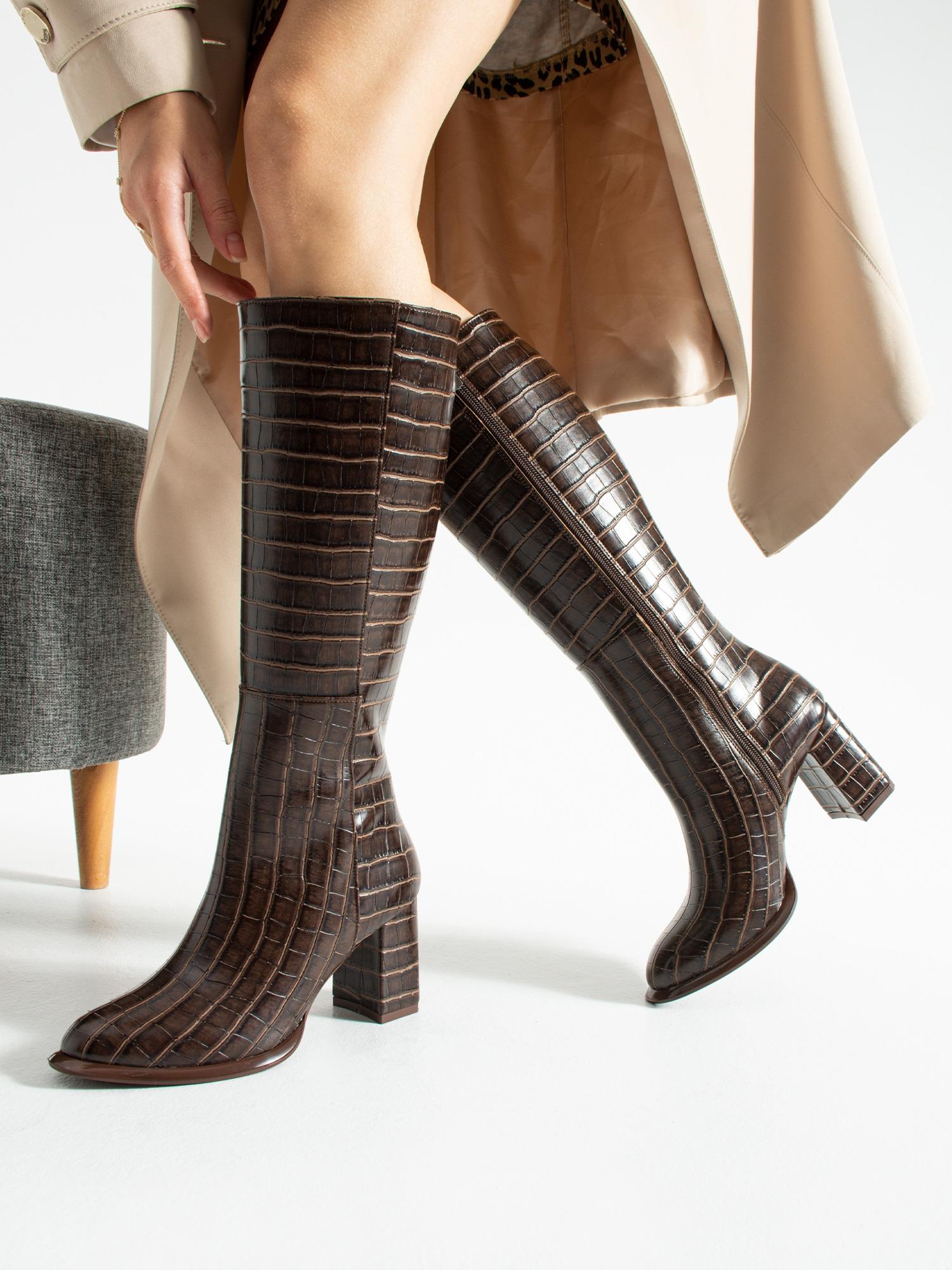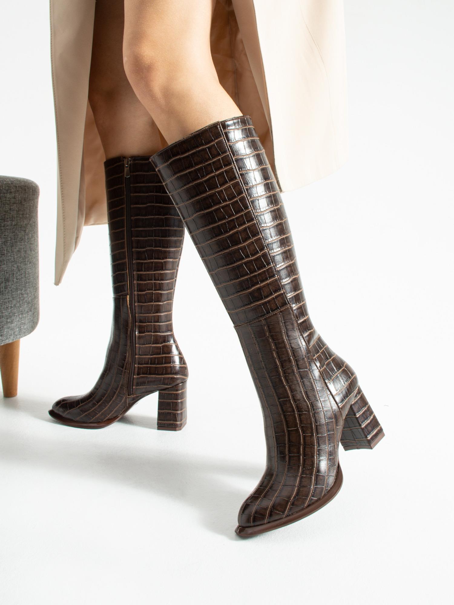 Zarif krokodil desenli uzun topuklu çizme, modern şıklığı ve konforu bir araya getirir. Kış kombinlerinize sofistike bir dokunuş katar, güçlü stil sunar.