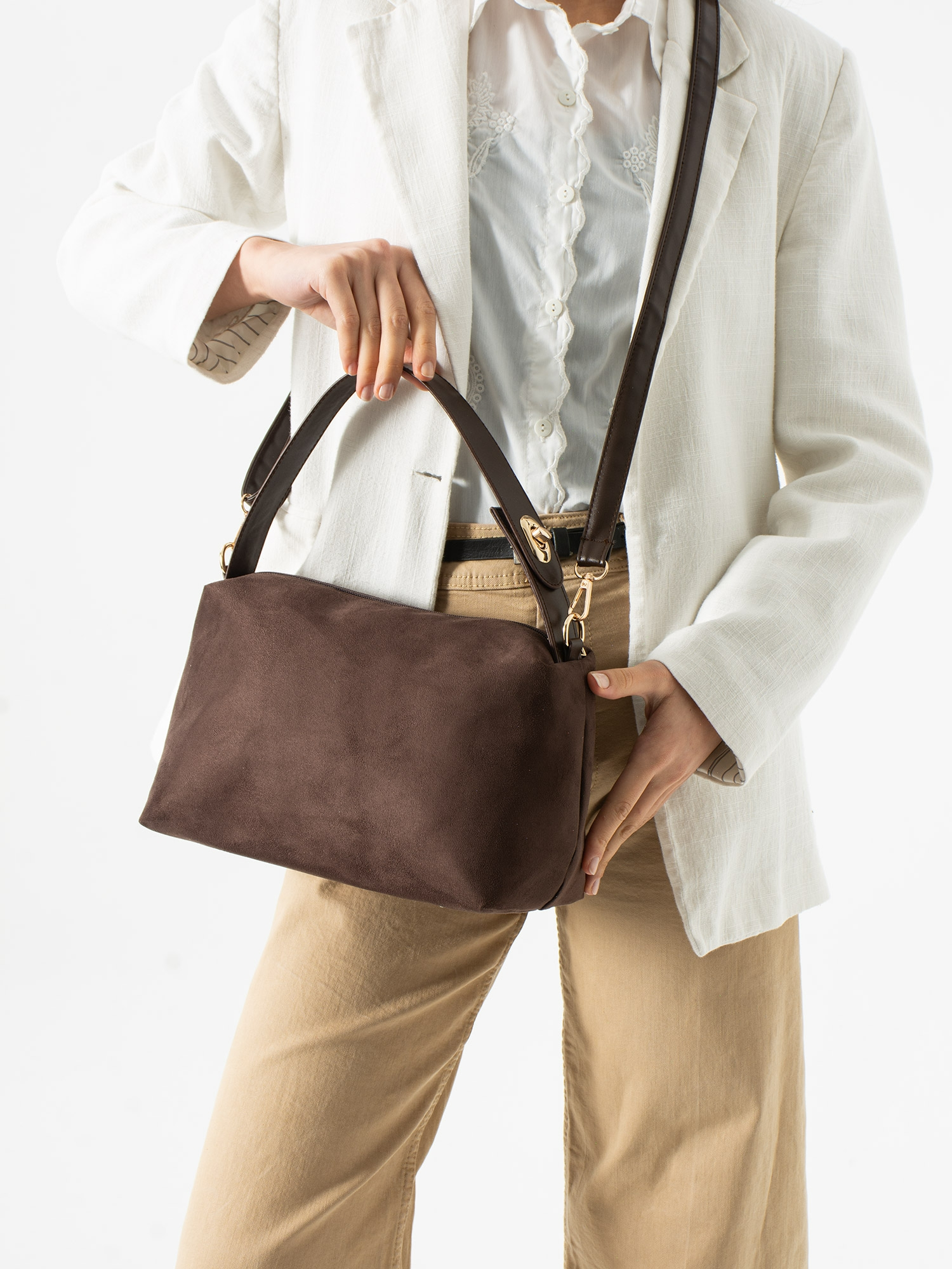 Zamansız tasarımı ve yumuşak dokusuyla öne çıkan bu kadın çanta, günlük kullanımdan şık kombinlere kadar her stile kolayca uyum sağlar. Süet görünümlü yüzeyi modern bir duruş sunarken, sağlam yapısı ve kaliteli metal aksesuarlarıyla uzun ömürlü kullanım sağlar.