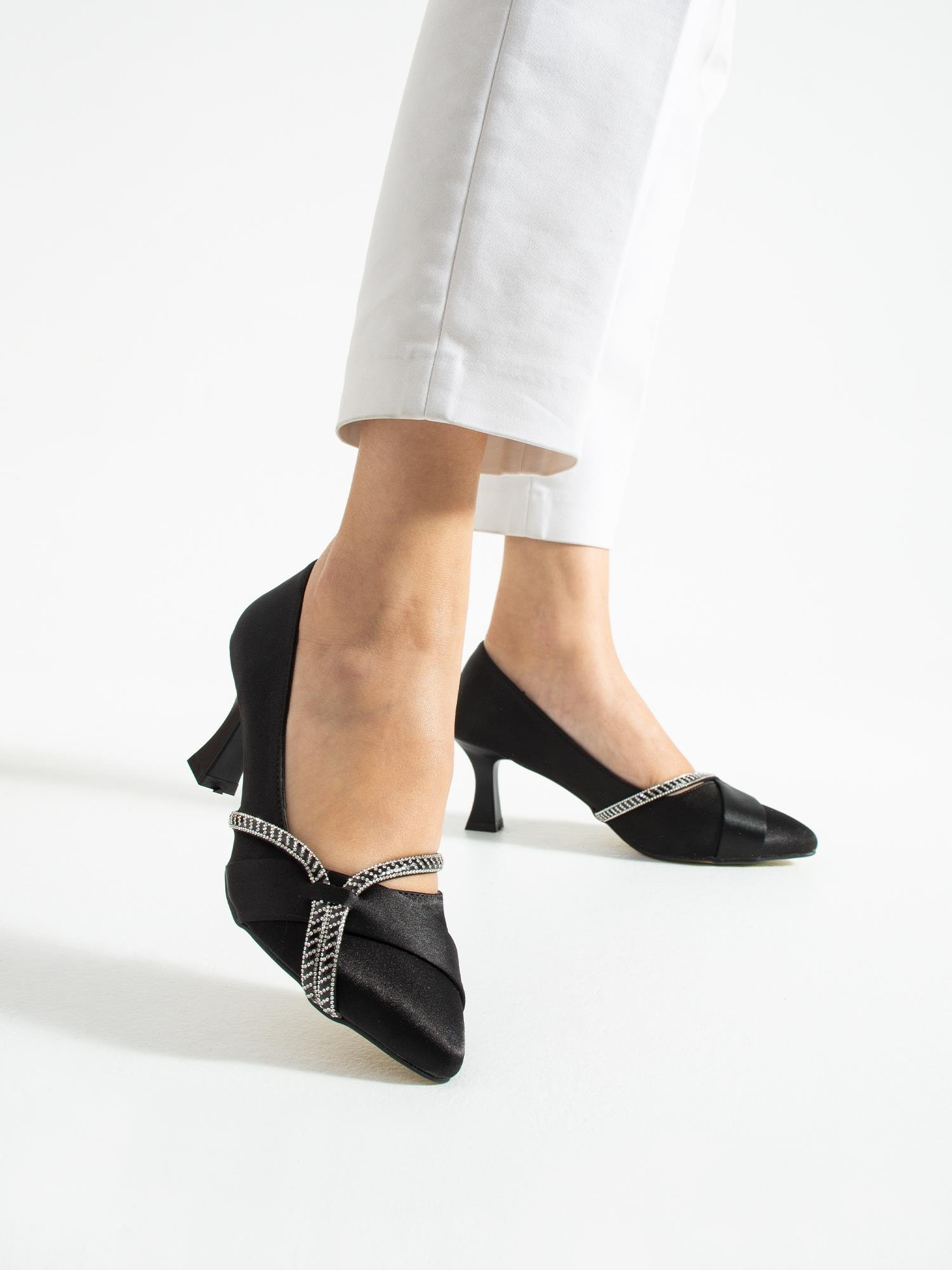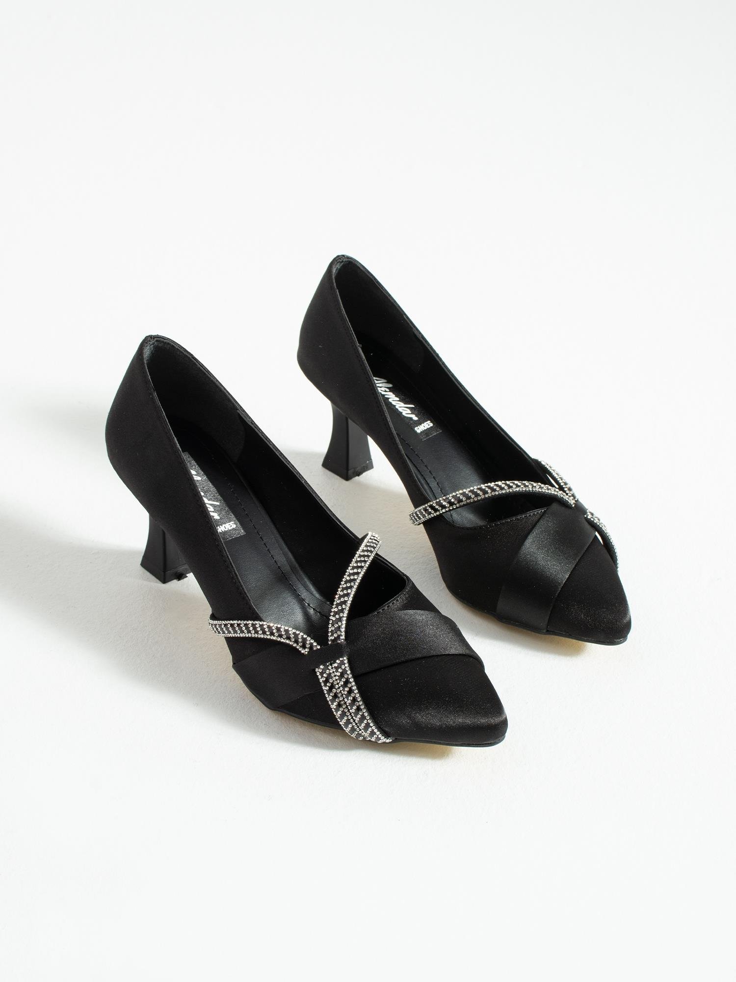 VELOX Siyah Saten Taş Detay Topuklu Kadın Ayakkabı (VELOX-SYHSATEN)