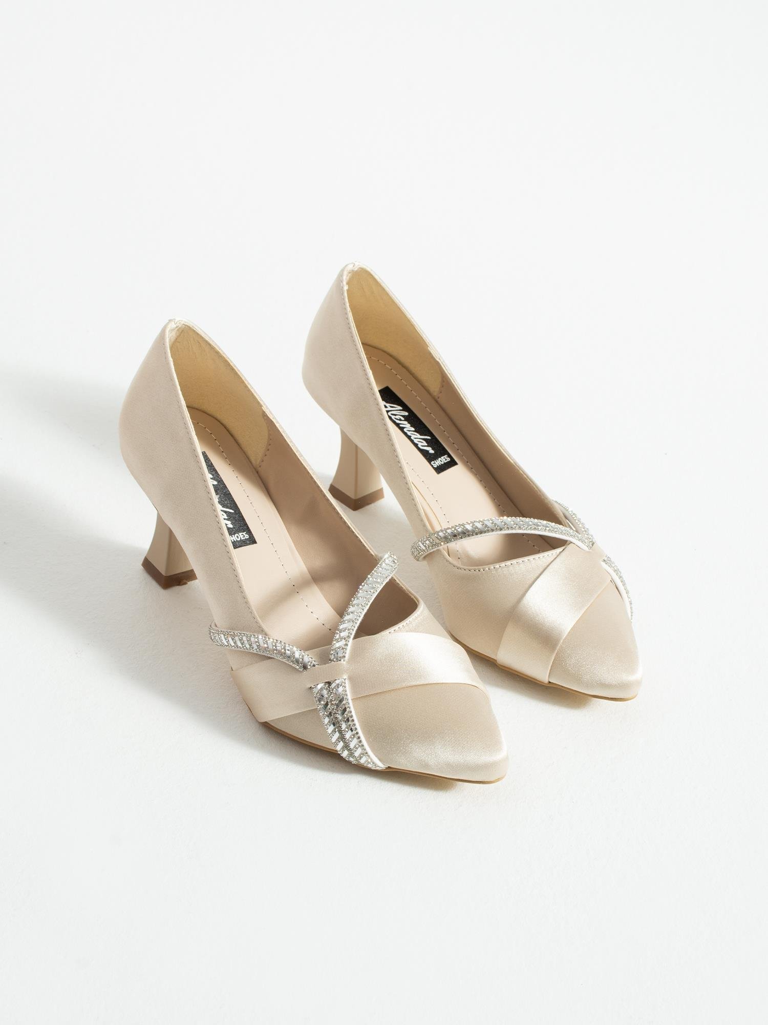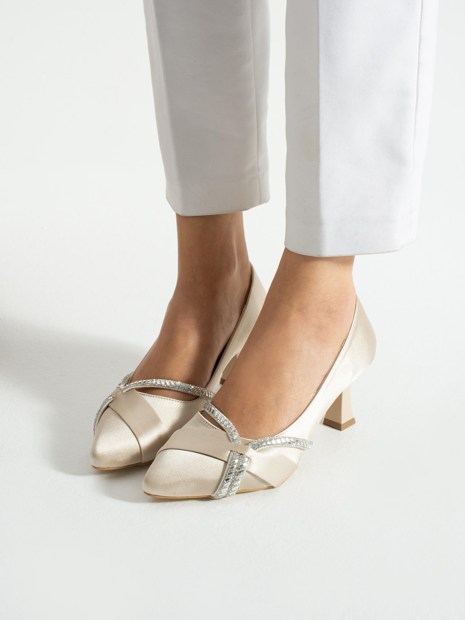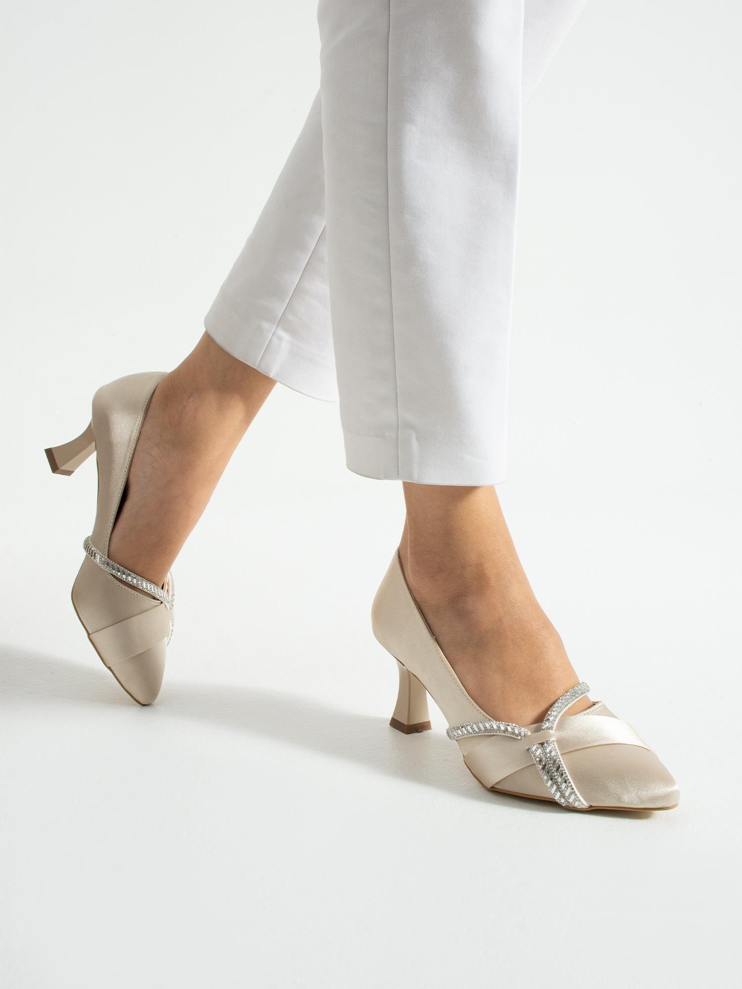 Zarif taş detaylarıyla ışıldayan bu saten abiye ayakkabı, özel davetler ve şık kombinler için mükemmel bir tercihtir. Orta boy topuğu sayesinde rahat bir kullanım sunarken, çapraz bant tasarımı ayaklara zarif bir duruş katar. Klasik siyah ve asil krem renk seçenekleriyle davetlerden düğünlere, tüm özel günlerde şıklığınızı tamamlayın